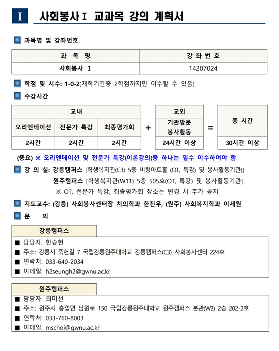 사회봉사교과목 수강 신청 학생은 붙임 파일의 기관 정보 및 교과목 운영 내용을 반드시 확인하시기 바랍니다.